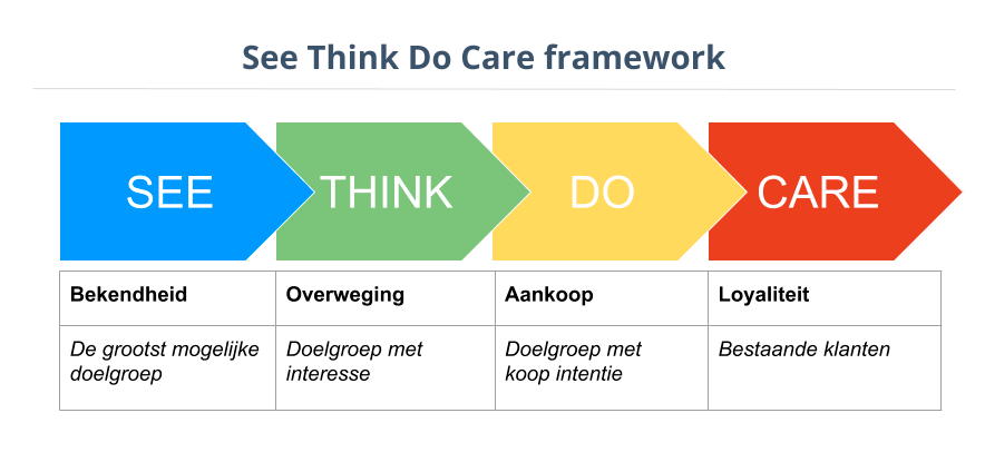 Belangrijk om te benadrukken is dat wij gebruikmaken van het See, Think, Do, Care-model van Google om de remarketingstrategie te optimaliseren. Dit model, gebaseerd op het in kaart brengen van de customer journey, bestaat uit vier fases: See (eerste contact met het bedrijf), Think (actief zoeken naar een oplossing), Do (klaar om te converteren) en Care (na de aankoop om klanten te behouden). Het stelt ons in staat om op specifieke momenten met relevante boodschappen te targeten, wat de effectiviteit van remarketing aanzienlijk verhoogt.